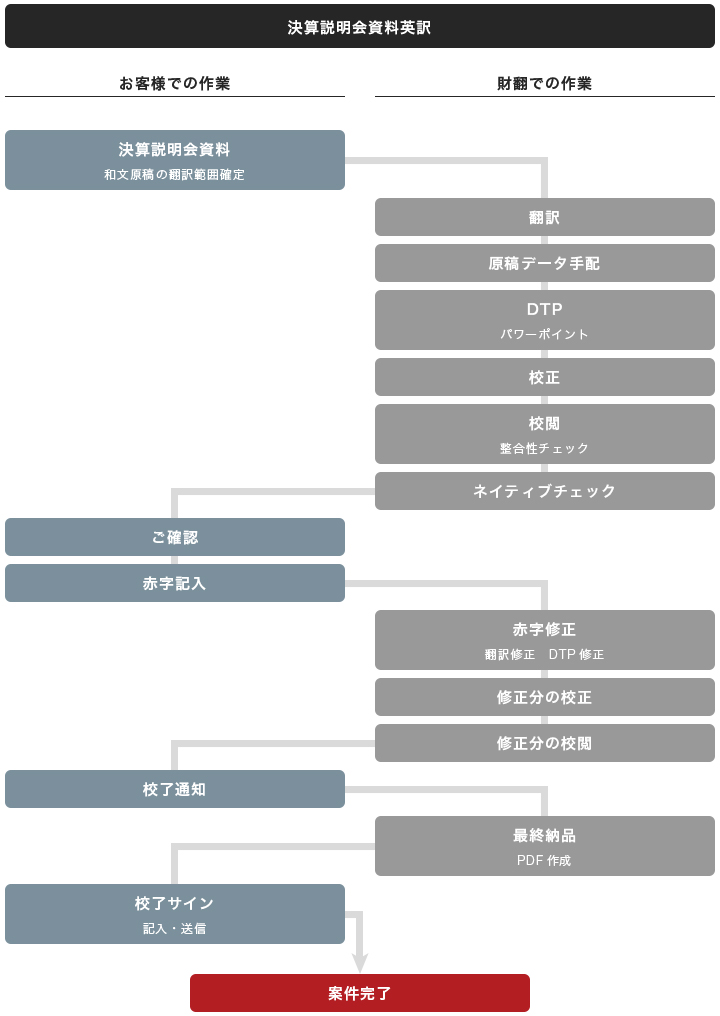 パワーポイントでは少ない文字数で表現されますので、タイトルをはじめ、文章自体が凝縮され、深い意味が込められています。その意味を正しく読み取り、的確な英語表現にするため、財翻ではバイリンガルのネイティブ翻訳者と日本人チェッカーがチームを組んで英文を作成しています。